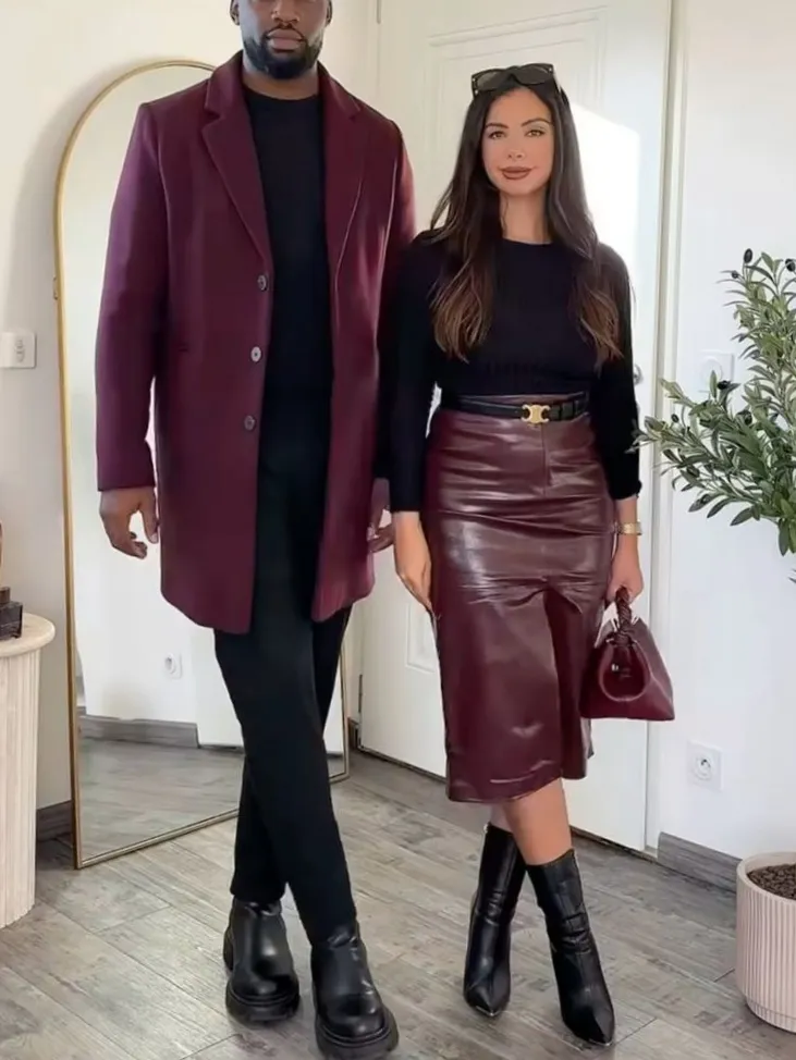 If you want to look like that “cool fashion couple,” go for layers. Mixing different fabrics like leather, wool, and satin all in the same color family creates so much depth.