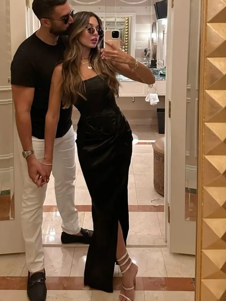 A white mini dress with a black coat is one of those combos that just looks expensive without even trying. Adding his leather jacket into the mix gives it that cool, modern edge that I’m obsessed with.