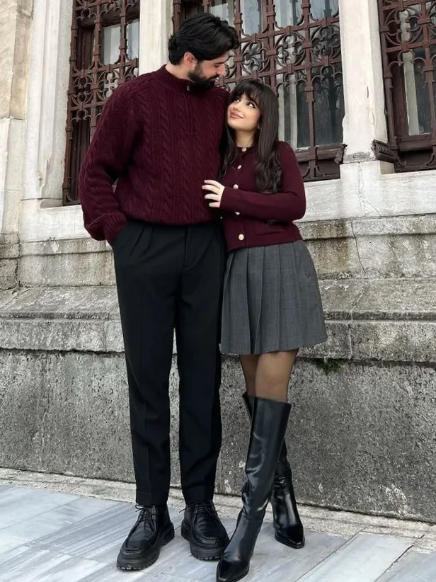 - If you’re in a sweater, have him wear structured trousers or dark denim to balance the textures.