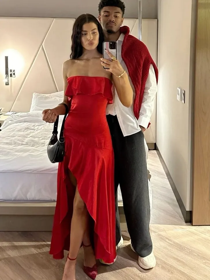 This is that “fail-proof” combo. Her deep burgundy against his crisp white shirt just feels expensive and timeless.