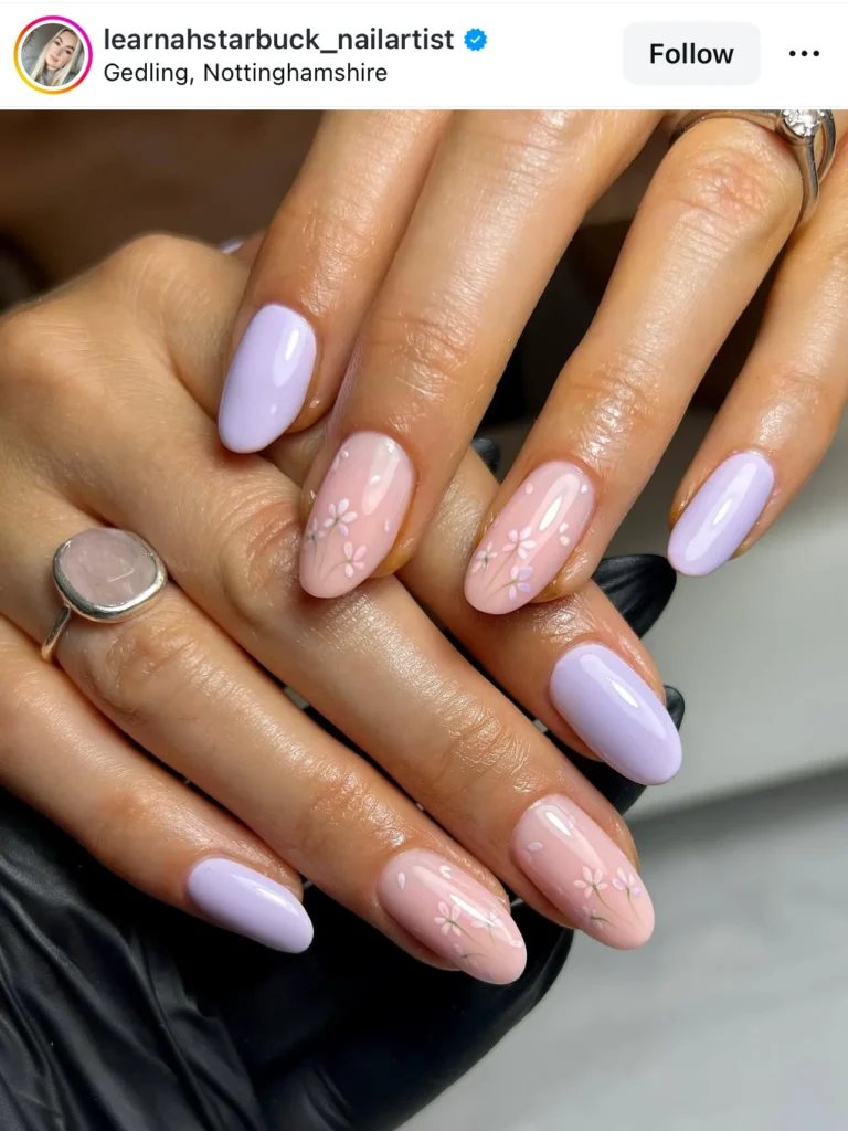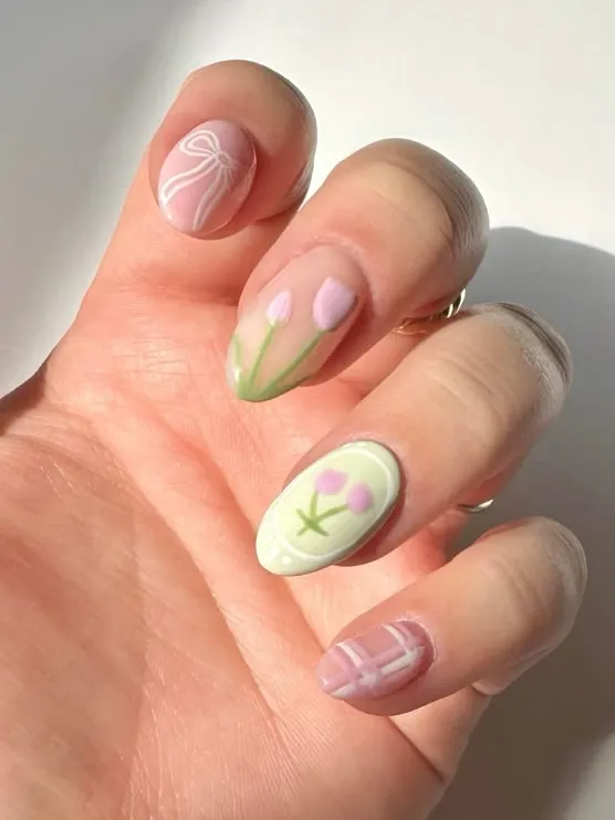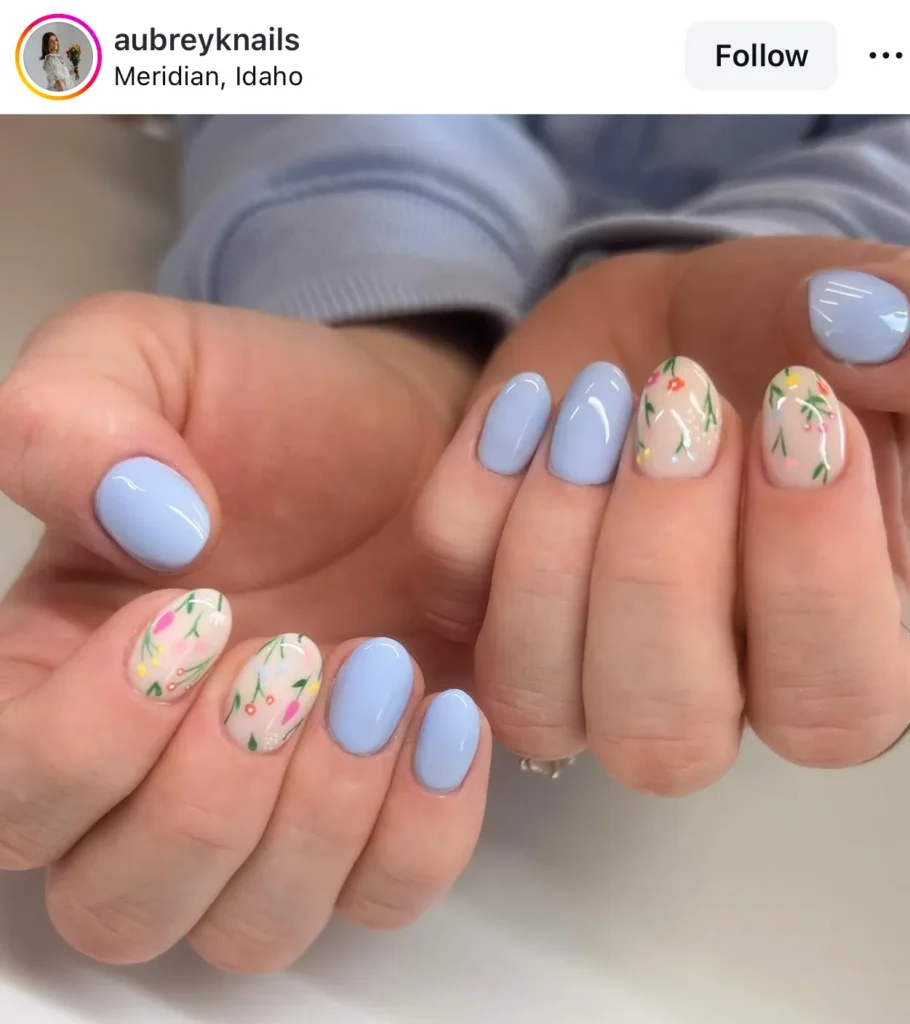 Mixing solid peach and green with floral accents feels so vibrant. It’s the perfect Easter brunch nail idea.