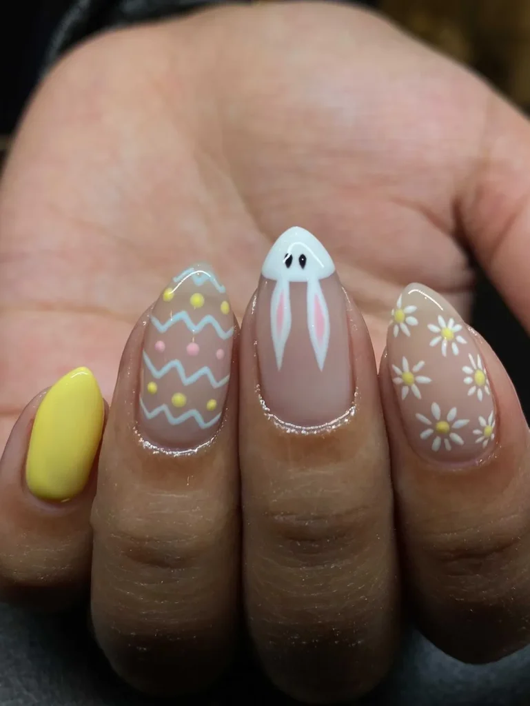 I love the idea of a tiny bunny on the middle finger paired with a daisy on the index finger. Since the colors match, it stays cute and cohesive without looking messy.