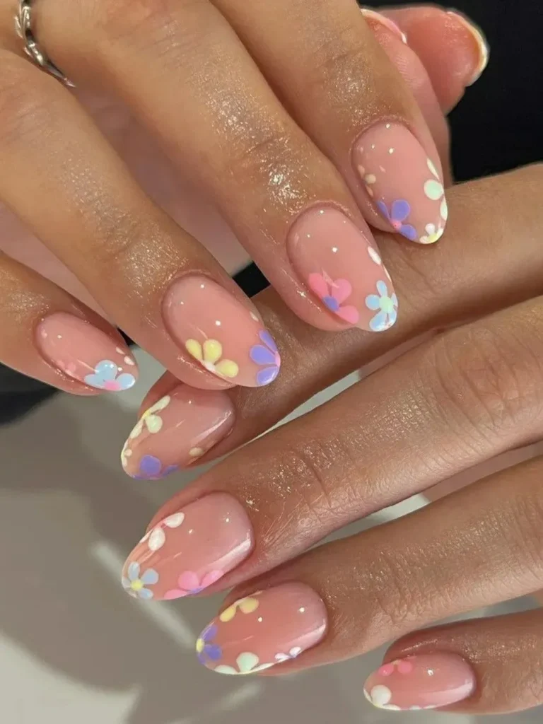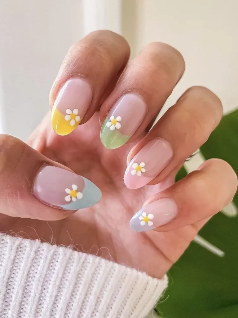 A different pastel tip on every finger, each with one tiny daisy.