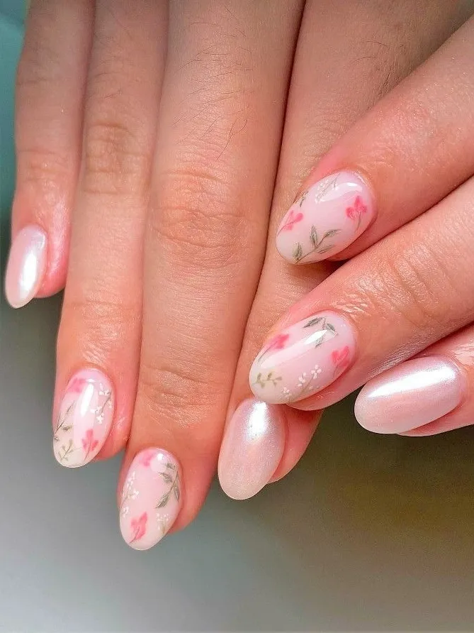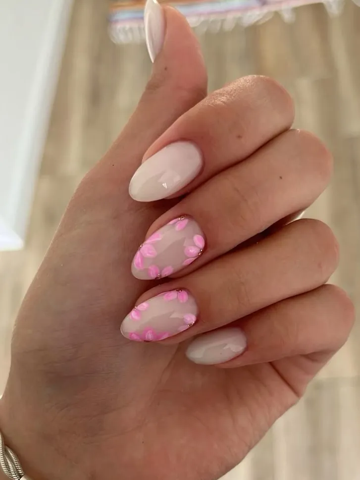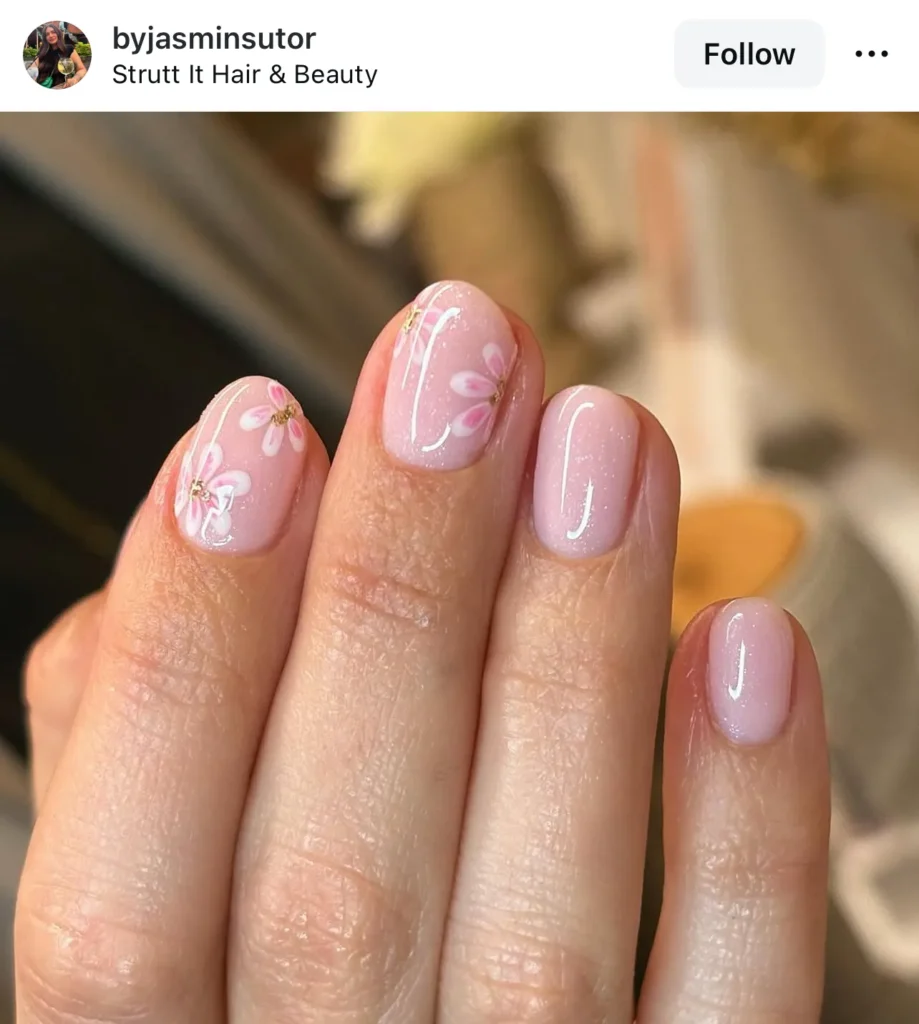 Just a few pink petals on the ring finger. It’s a clean, focused design that doesn’t feel like you’re trying too hard.