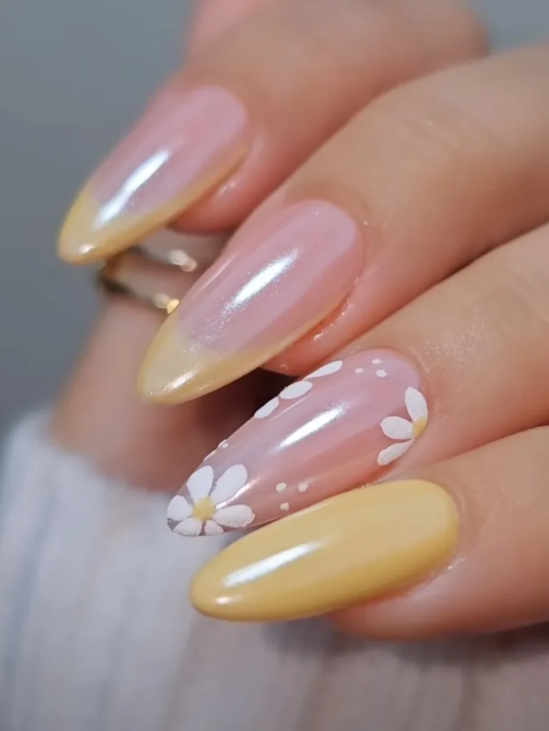 Pale yellow tips are so underrated. Add a single daisy and a chrome top coat, and you’ve got DIY Easter nails that look pro.