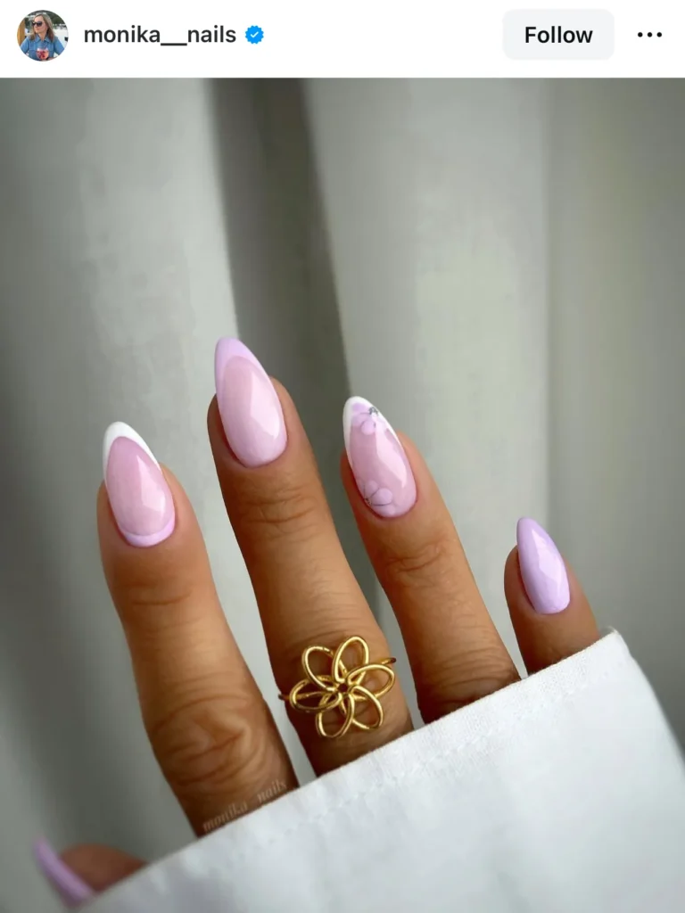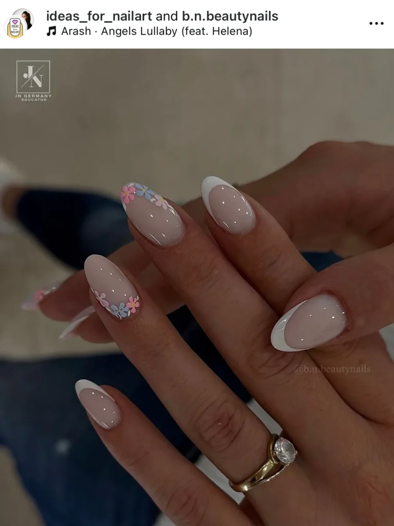 Finally, a classic white French tip surrounded by a “halo” of tiny pastel flowers.