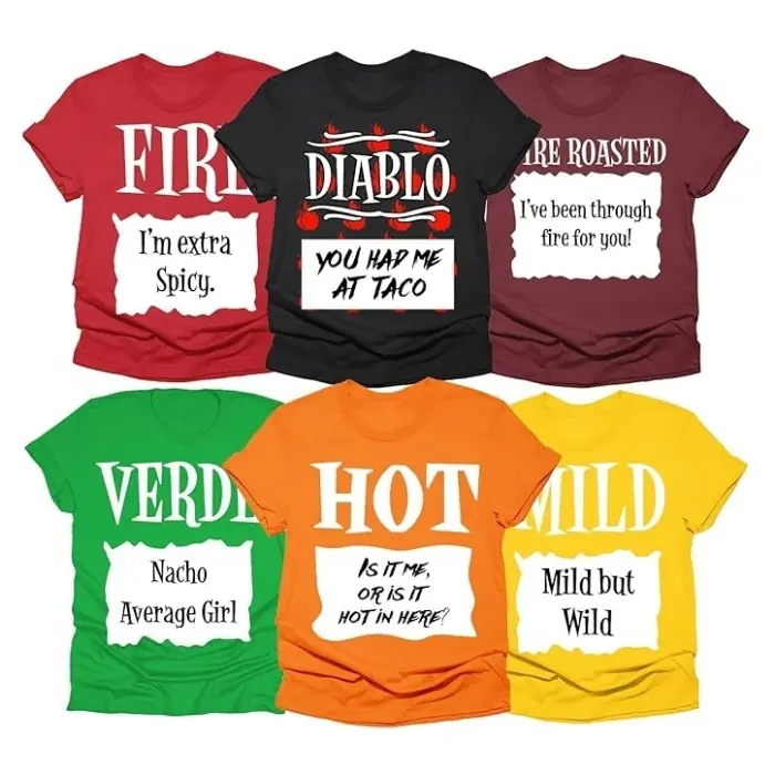I love this one because it’s both colorful and clever. Each friend picks a different Taco Bell sauce packet—mild, hot, fire—and when you’re together, it feels like a spicy squad rolling into the party.