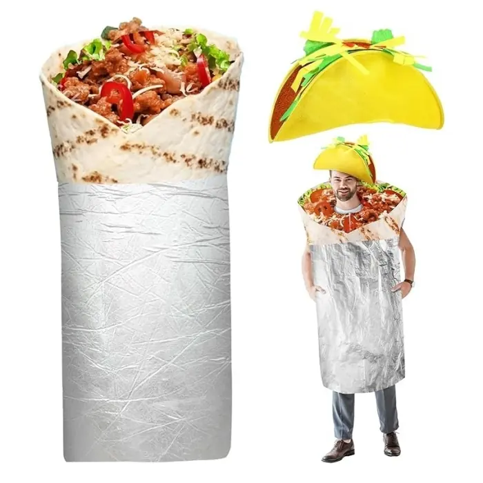 Burritos are a classic comfort food, and turning them into costumes is even better. Wrapped in foil with fun toppings peeking out, it’s the kind of silly group look that’s simple to pull off but surprisingly effective.