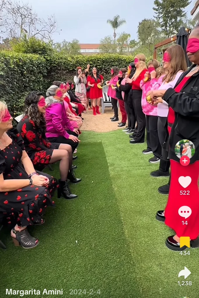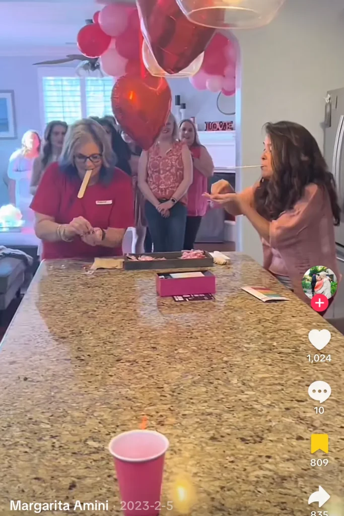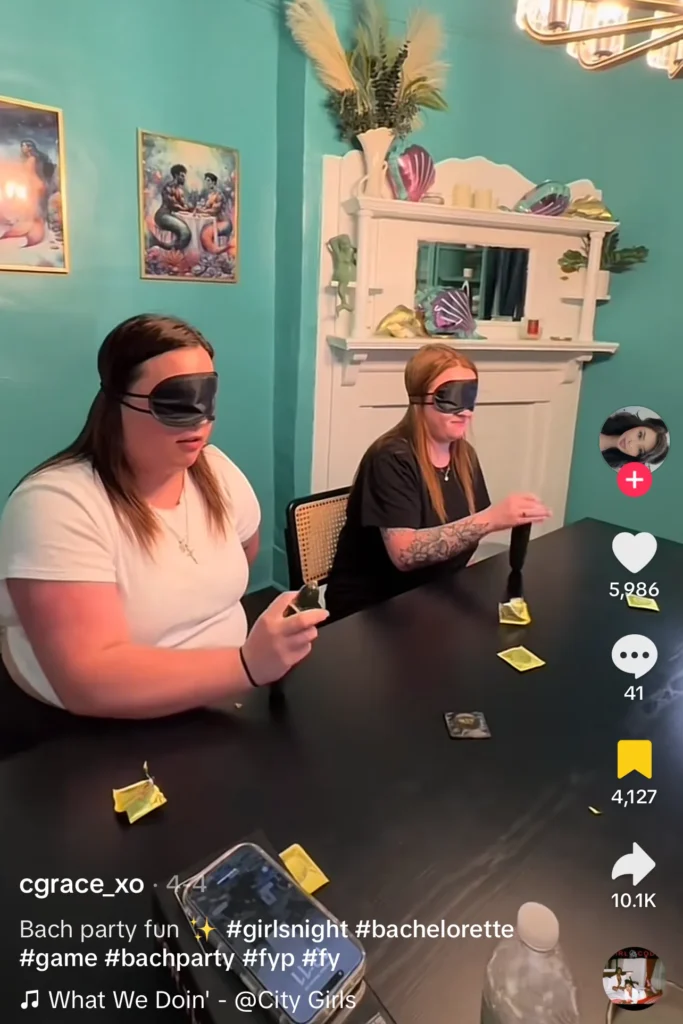 Blindfolded, one hand, trying to put a condom on a cucumber. It’s a bachelorette classic that always works for Galentine’s too.
