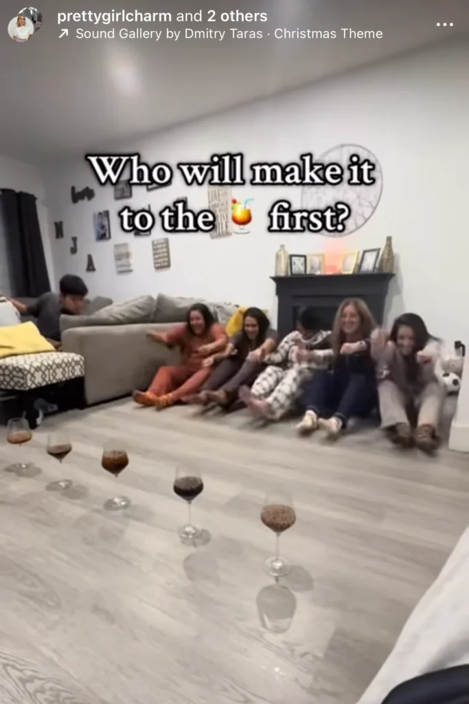 You roll a strip of toilet paper to bring a wine glass closer to you. If it tips or the paper breaks, you’re out. (Avoid white carpets!)