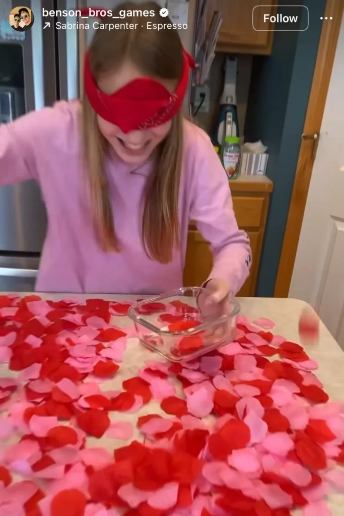 - Scatter pink and red petals (or small items) across a table.
