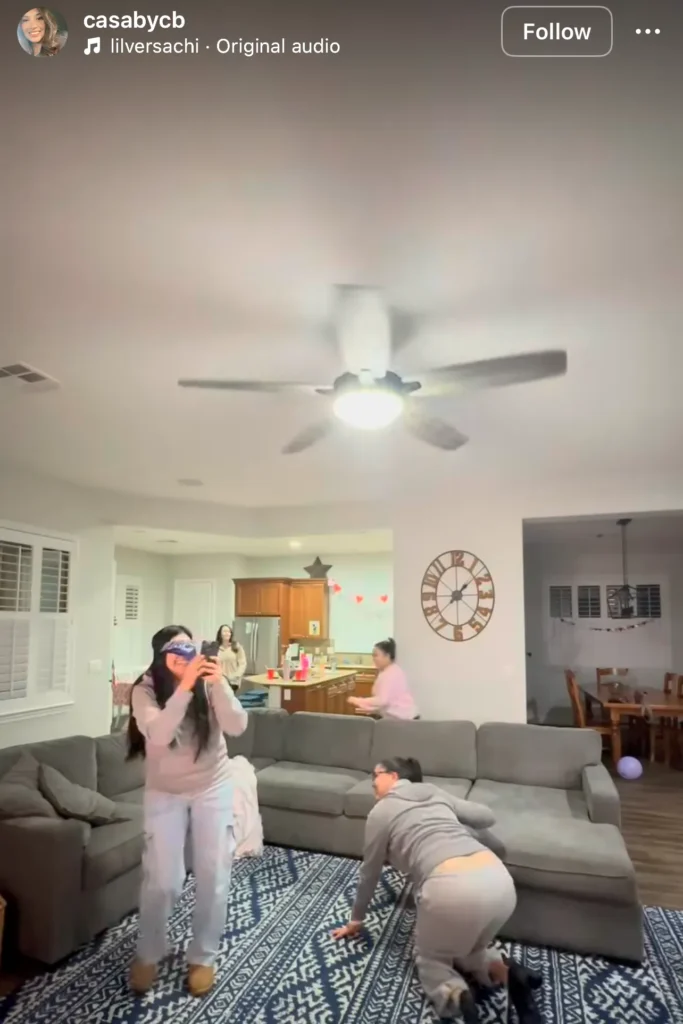 - One player is blindfolded and stands in the center of the room holding a phone camera.