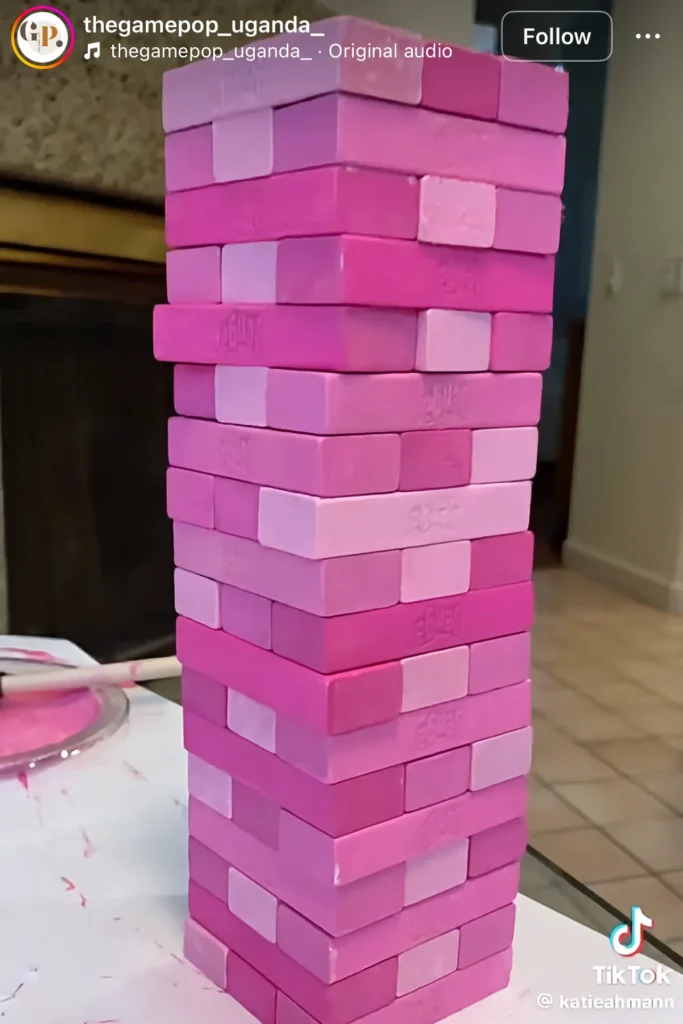 - Set up a pink Jenga tower.