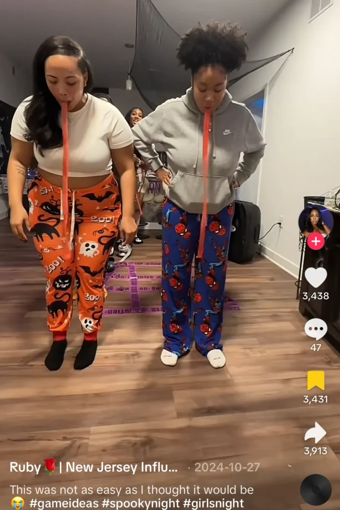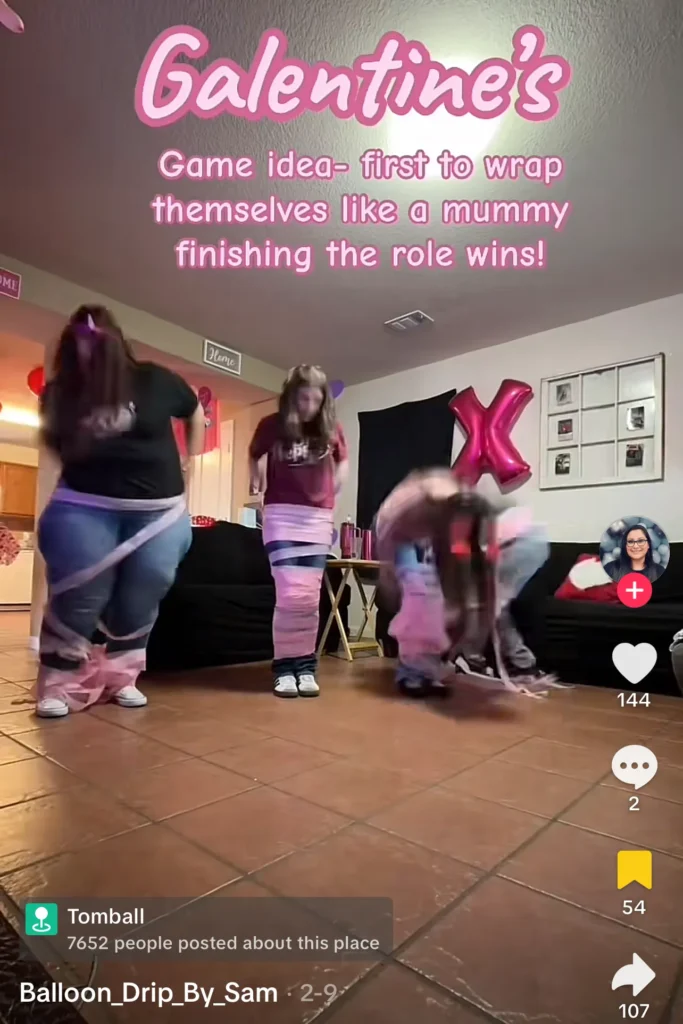 Grab some pink streamers or TP and try to wrap yourself up like a mummy. If the paper tears, you’re in trouble. It’s a race to see who finishes first.