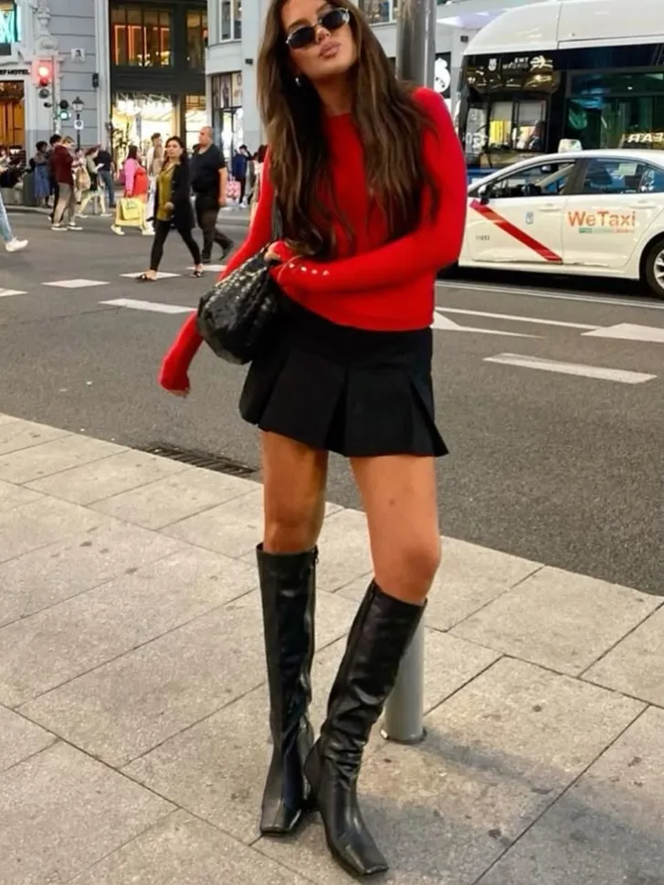 9. Soft Red Knit + Pleated Mini Skirt + Tall Boots