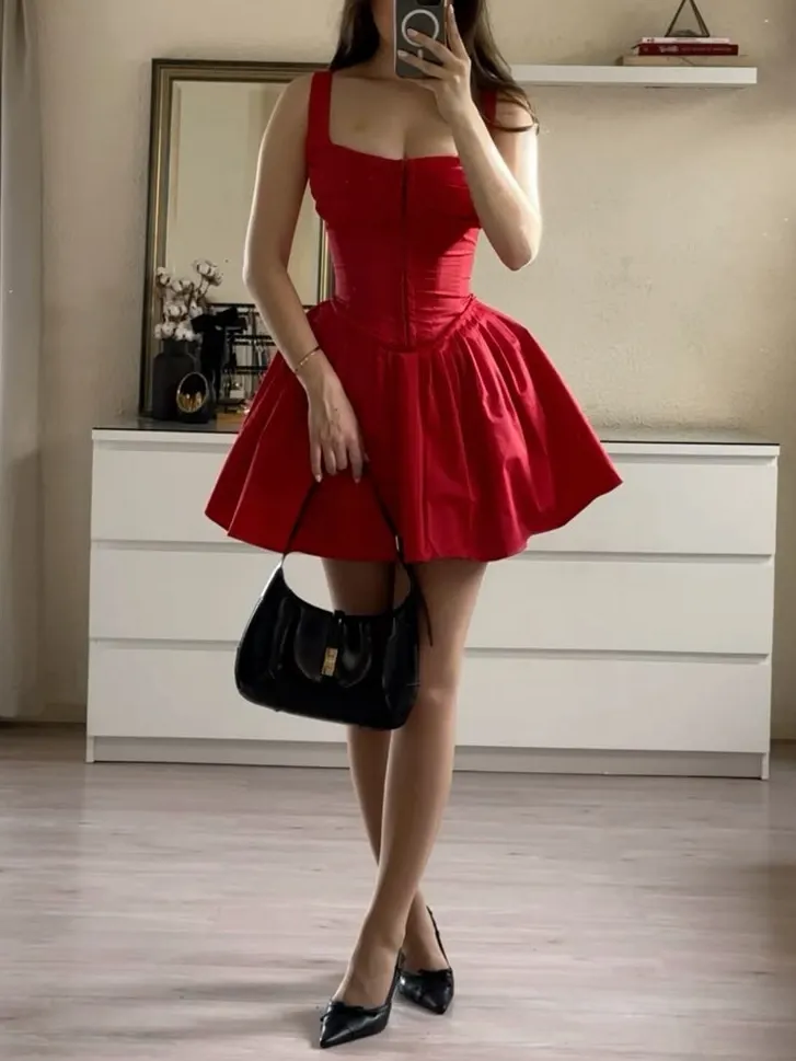 5. Red Structured Mini Dress + Pointed-Toe Heels
