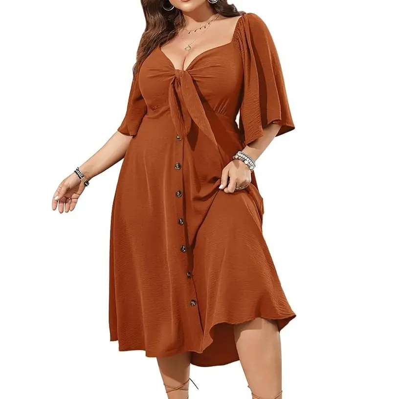 Dresses tend to flatter apple shapes naturally because they create one clean, continuous line. Simple silhouettes usually work especially well and make the whole outfit feel effortless.