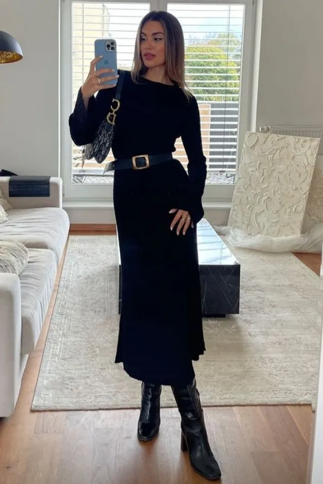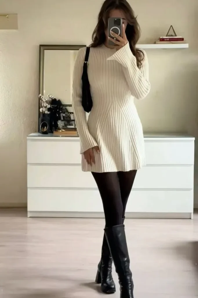 A fitted thermal top or a soft turtleneck makes a quiet difference once the temperature drops. That extra layer changes how a dress moves and how the warmth stays close to your body.