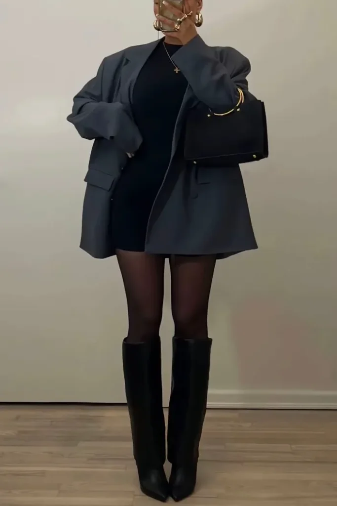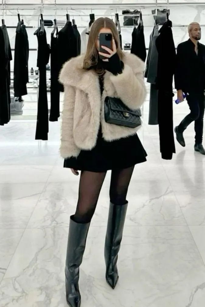 And if you’re heading out at night, a mini dress with tall boots just works. It’s warm enough to handle the cold but still confident and stylish.