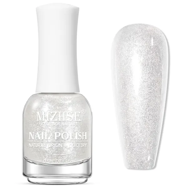 I think about this one when I want something clean but not boring. In sunlight it almost glows from inside, fading from white into a soft glaze. A bit of glitter sneaks through, quiet but perfect.