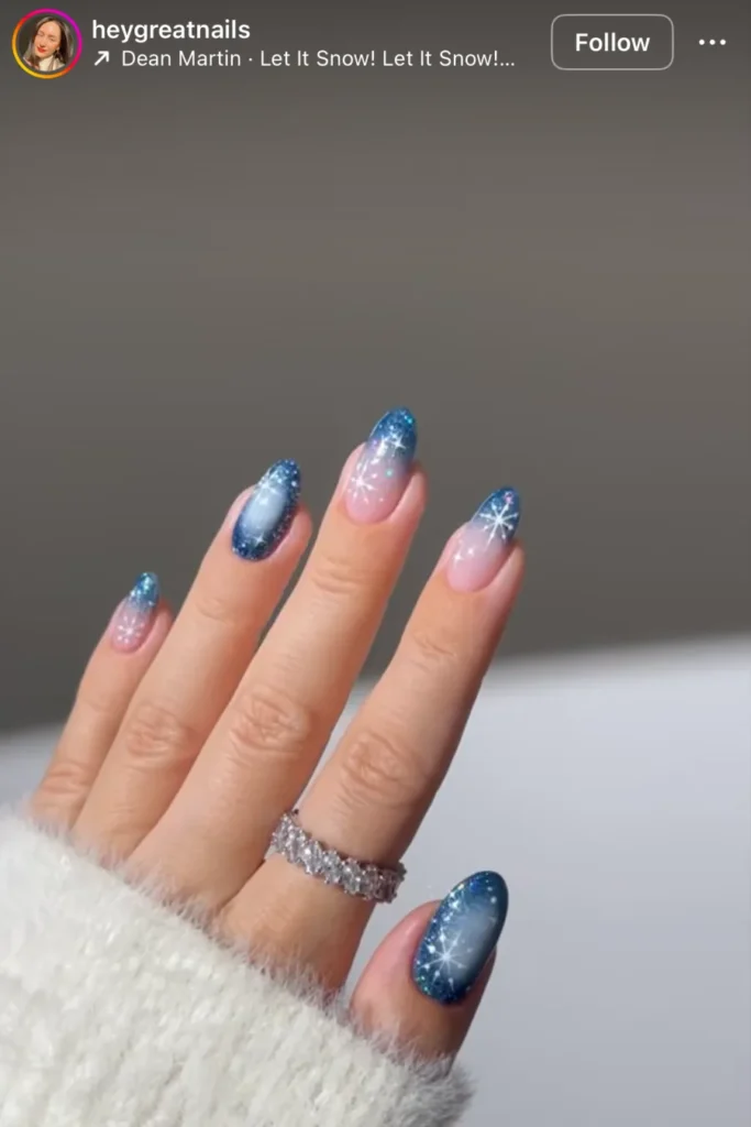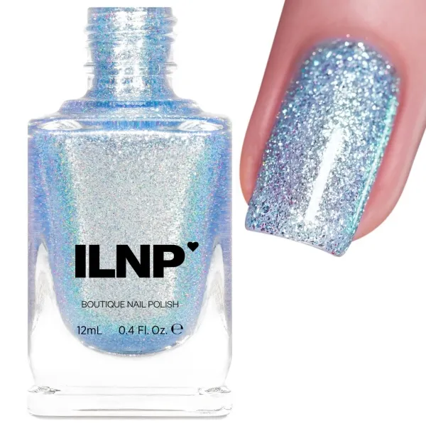 This design always reminds me of snow melting on glass. Blue glitter hides beneath a soft white haze, and it glows just enough when you move. It fits that winter brightness — maybe walking outside in a cream sweater, coffee in hand, when the air’s still cold.