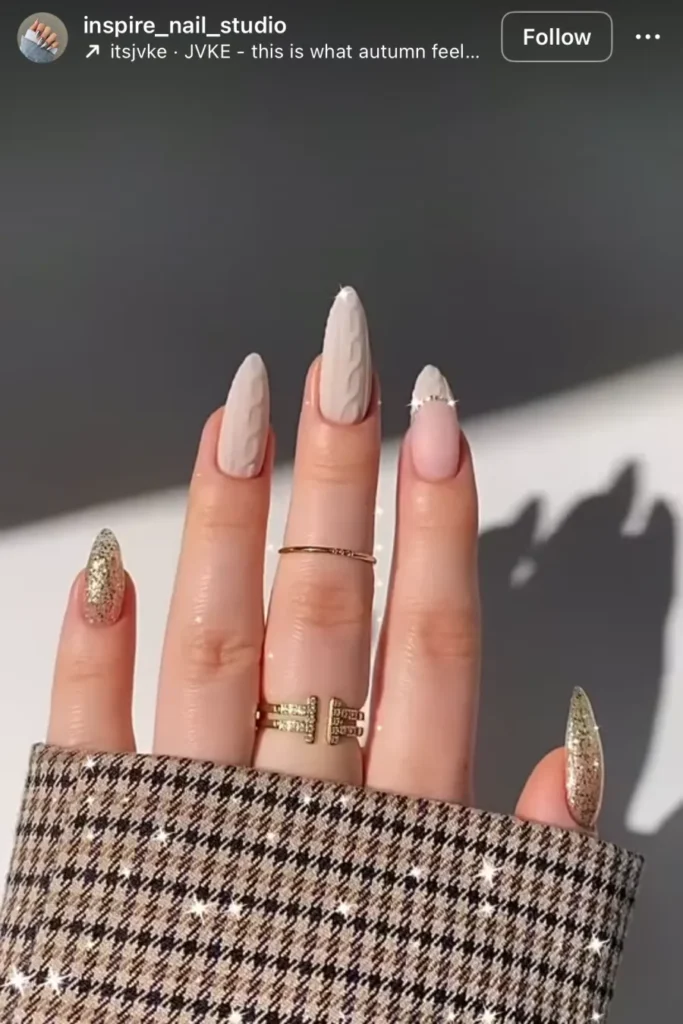You know that warm, glowy look that feels like candlelight? Gold dust floats over nude polish, catching light in little flashes. The sweater texture underneath keeps it cozy and real, not just pretty.