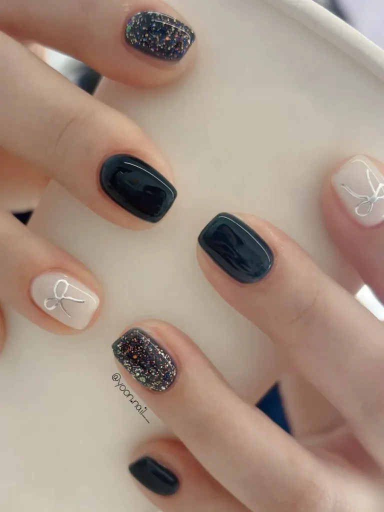 There’s a quiet confidence to this color mix. Navy feels steady, and the glitter bow adds a small touch that keeps it soft. It works on busy days or nights out — anything that needs a little polish without effort.