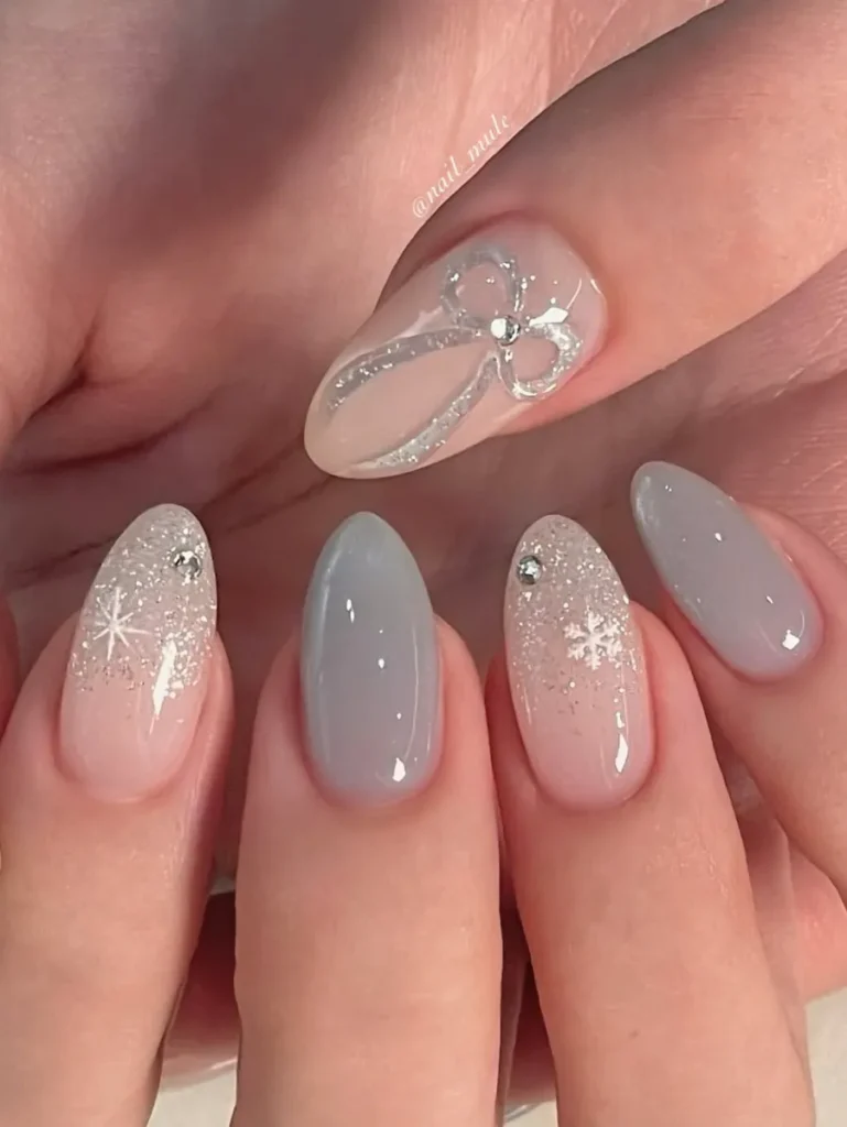 Mix of blue and white that looks cold but somehow soft? That’s what this feels like. When the glitter catches light, it’s like little snowflakes moving around. And that tiny bow — yeah, that’s what makes it too cute to skip.