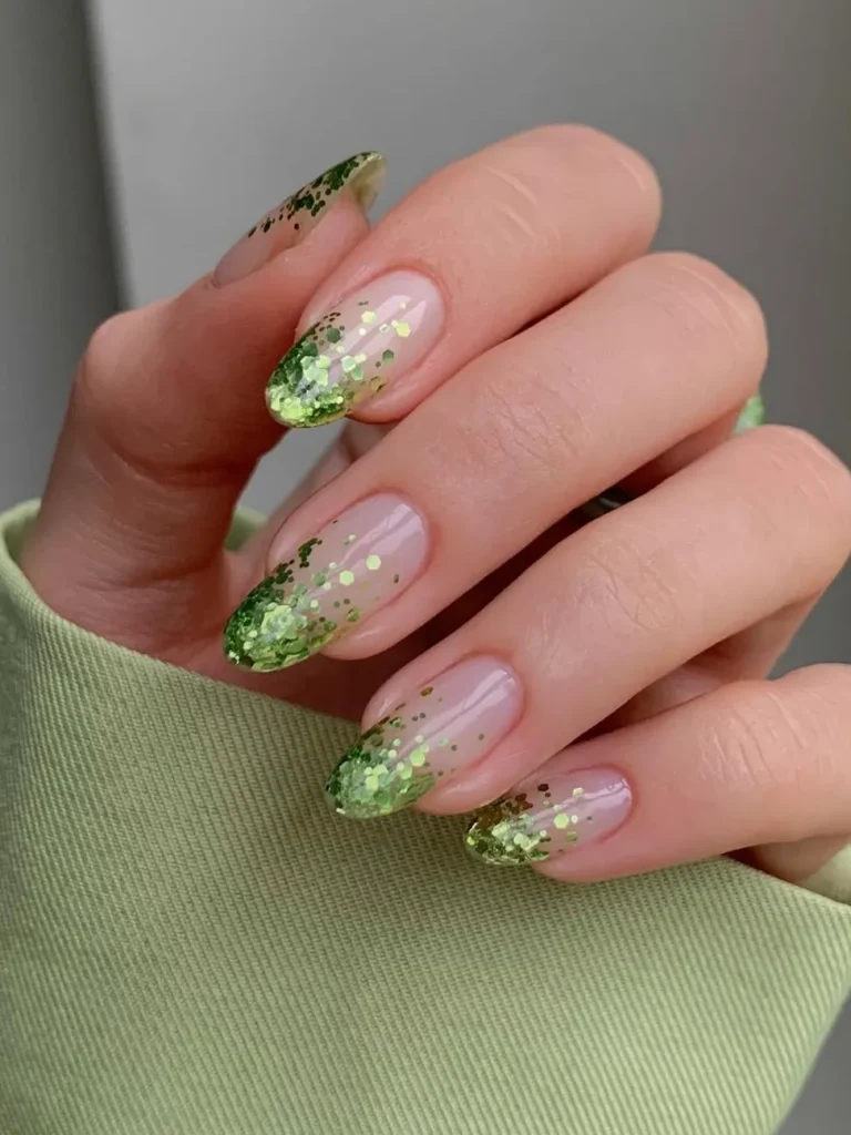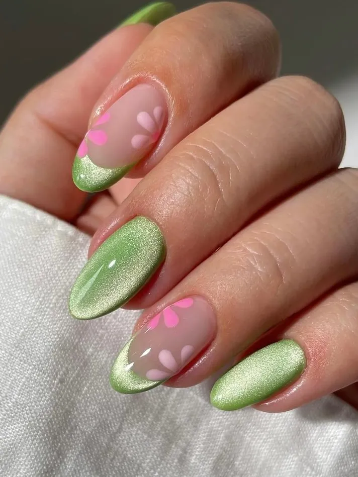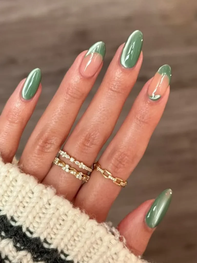 If the basic green French felt too quiet for you, this is the glow-up. A touch of green chrome on the tips catches the light in the best way possible.