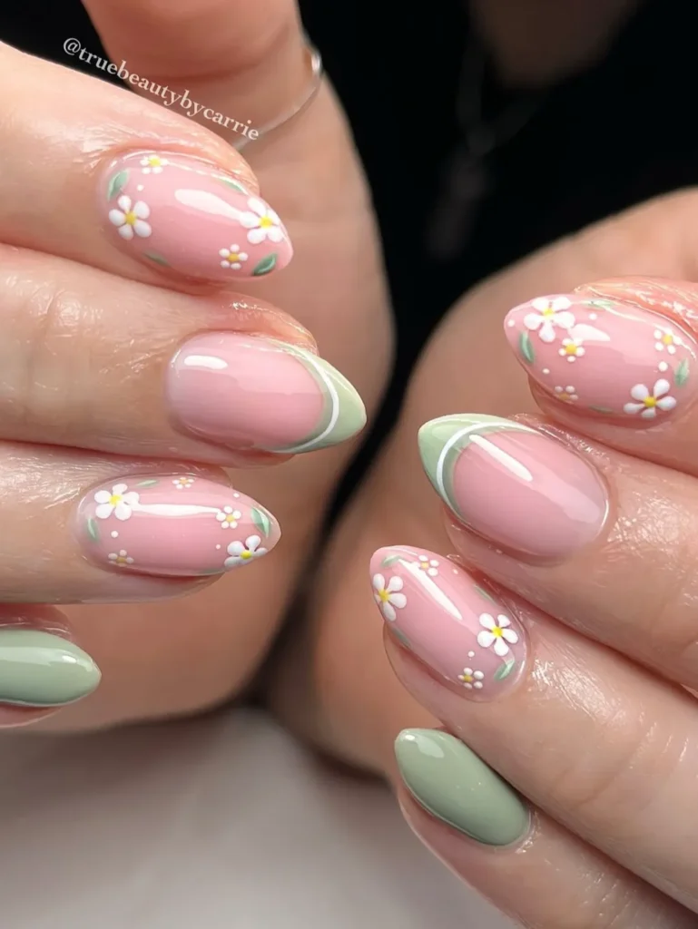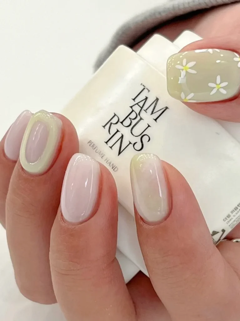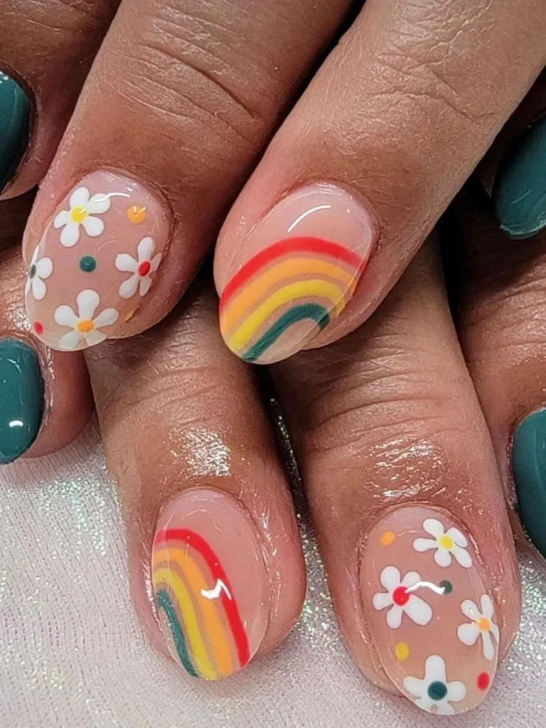 Trust me, it’s cheerful, not childish. A few rainbow accents with tiny daisies keep things light, especially if you keep the base clean and neutral. It’s just happy nails, period.