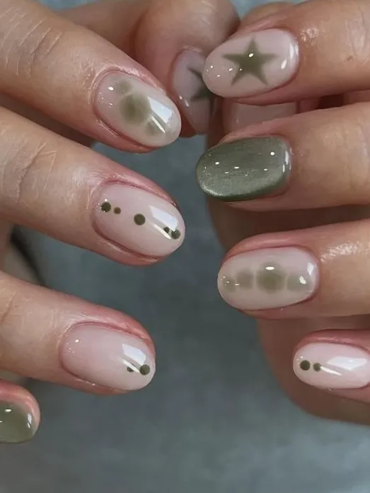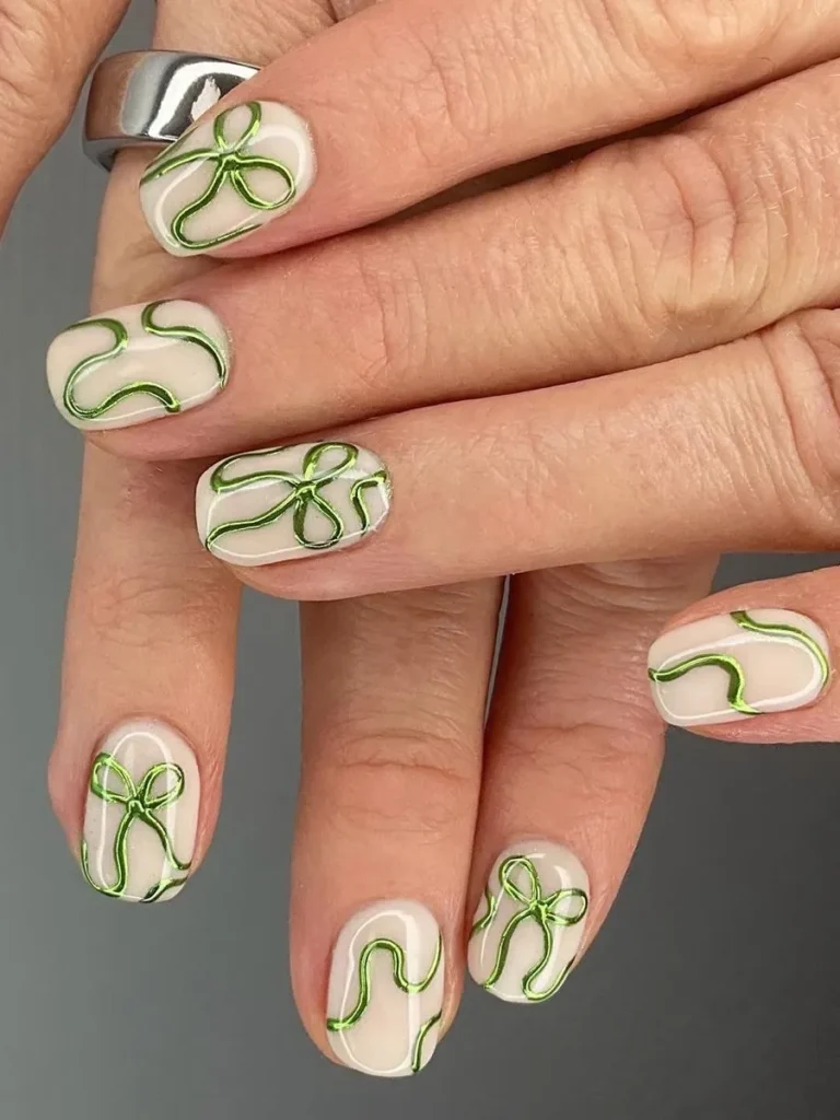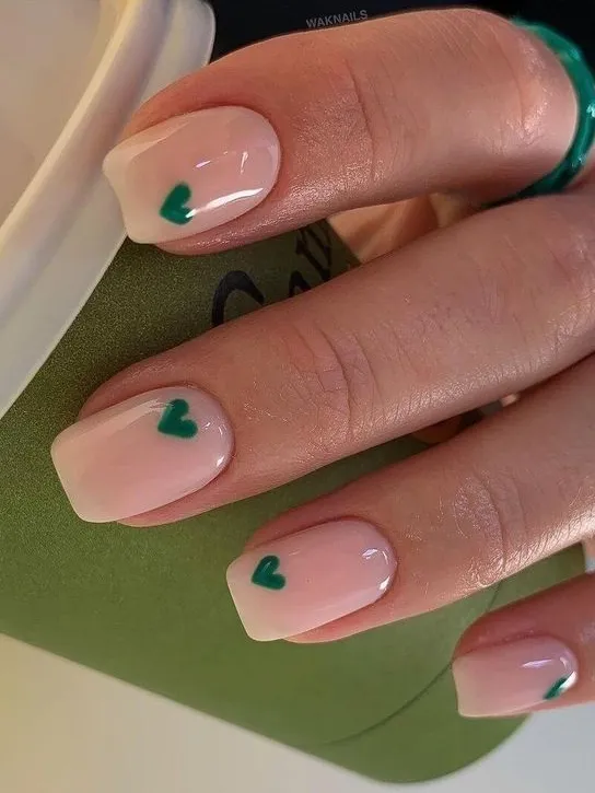I love this because it feels like a secret detail. Keep the base nude and add one tiny green heart on a single finger—it’s something people notice only after they’ve already complimented your nails.