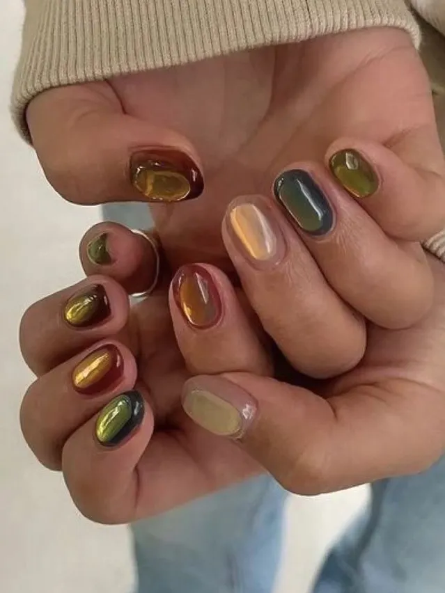 If you’re not ready to let go of shimmer, you don’t have to. They catch the light in a way that feels warm and fresh, giving your nails a soft, lit-from-within glow rather than a full metallic shine.