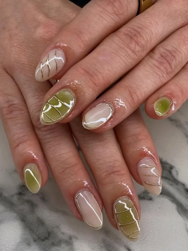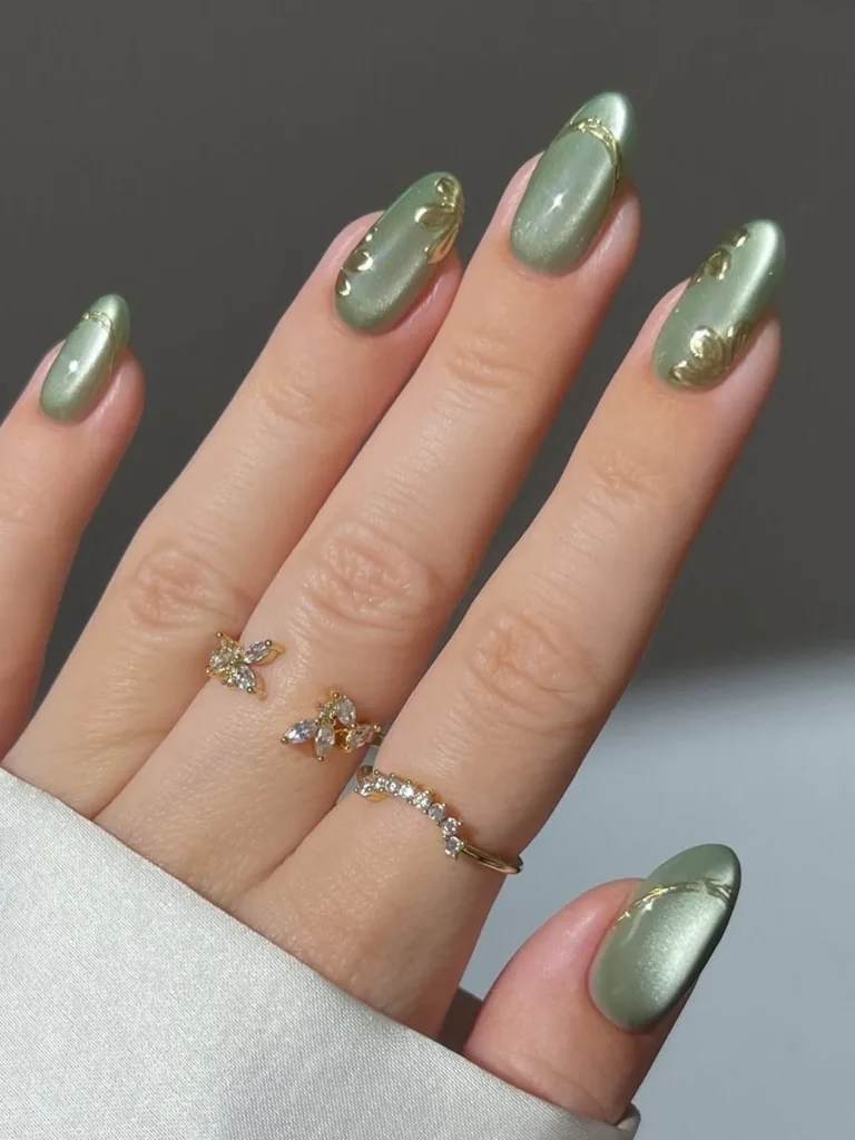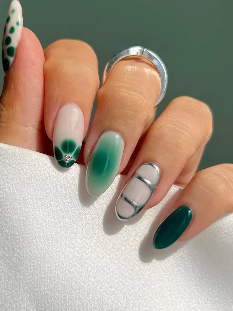 You don’t have to go full metallic on all ten fingers. Pairing a solid, dark green with just one chrome accent finger feels much more modern and balanced.
