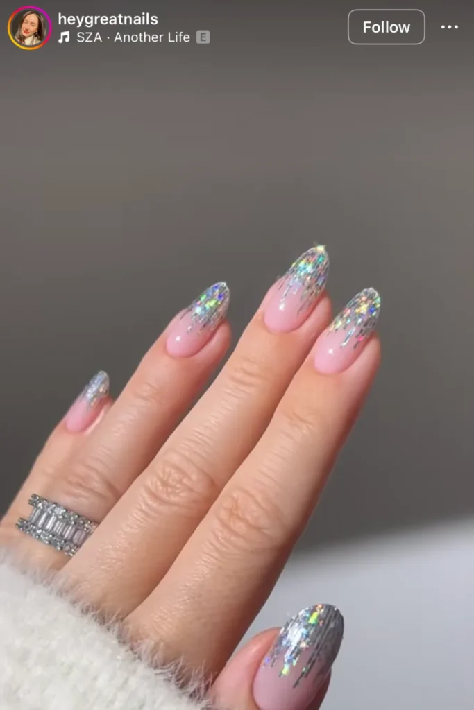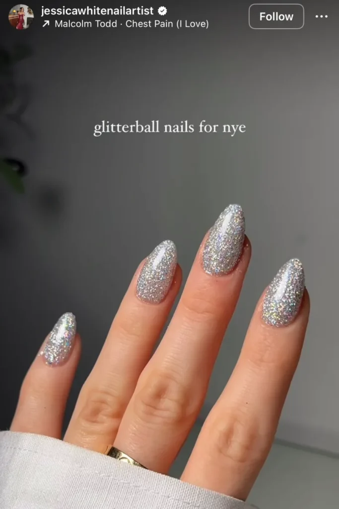 This is where subtlety goes to die, and honestly, I’m fine with that. The chunky silver sparkles look like a disco ball decided to live on your fingertips. It’s messy, loud, and so unapologetically New Year’s Eve.