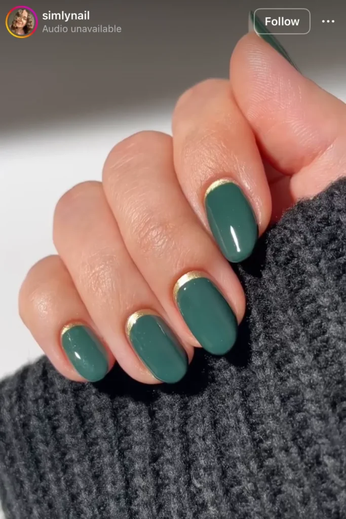 Green and gold — it shouldn’t be this elegant, but it is. The shimmer around the cuticle catches just enough light to look rich, not loud. It feels like something you’d wear to dinner when you don’t want to try too hard but still want to be noticed.