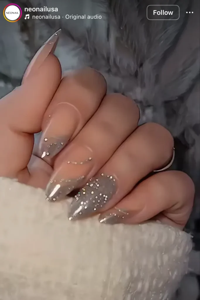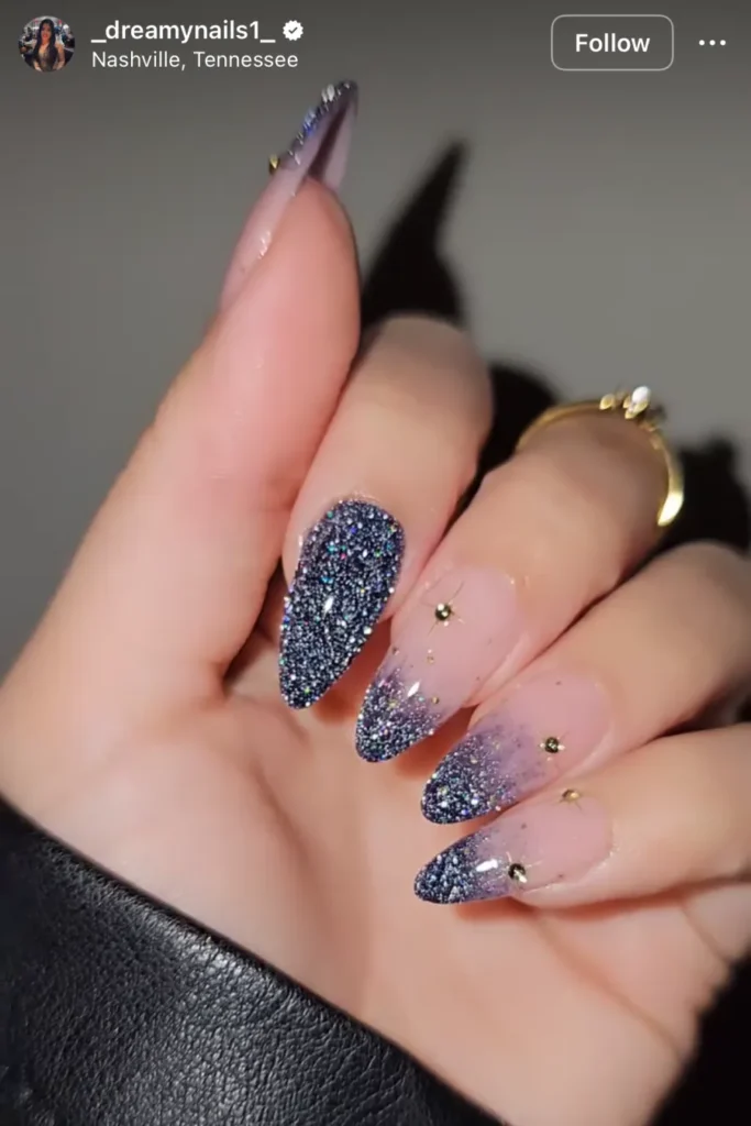 This one goes all in. The black glitter melts into a gradient that catches every bit of light, and the rhinestones throw in that final hit of glam. When the lights are low, it’s the only thing you’ll see.