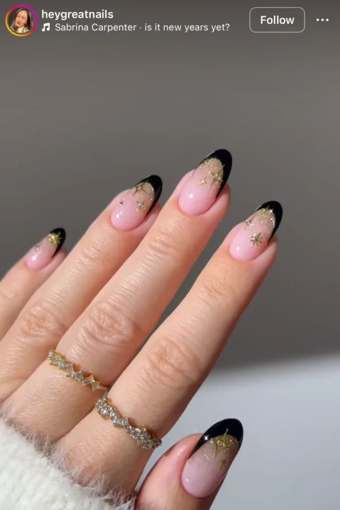 The mix of black and gold always feels powerful. There’s something about those golden sparkles glowing under the tips that gives off pure confidence — like you’re not here to blend in tonight.