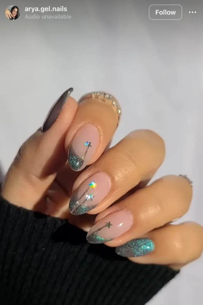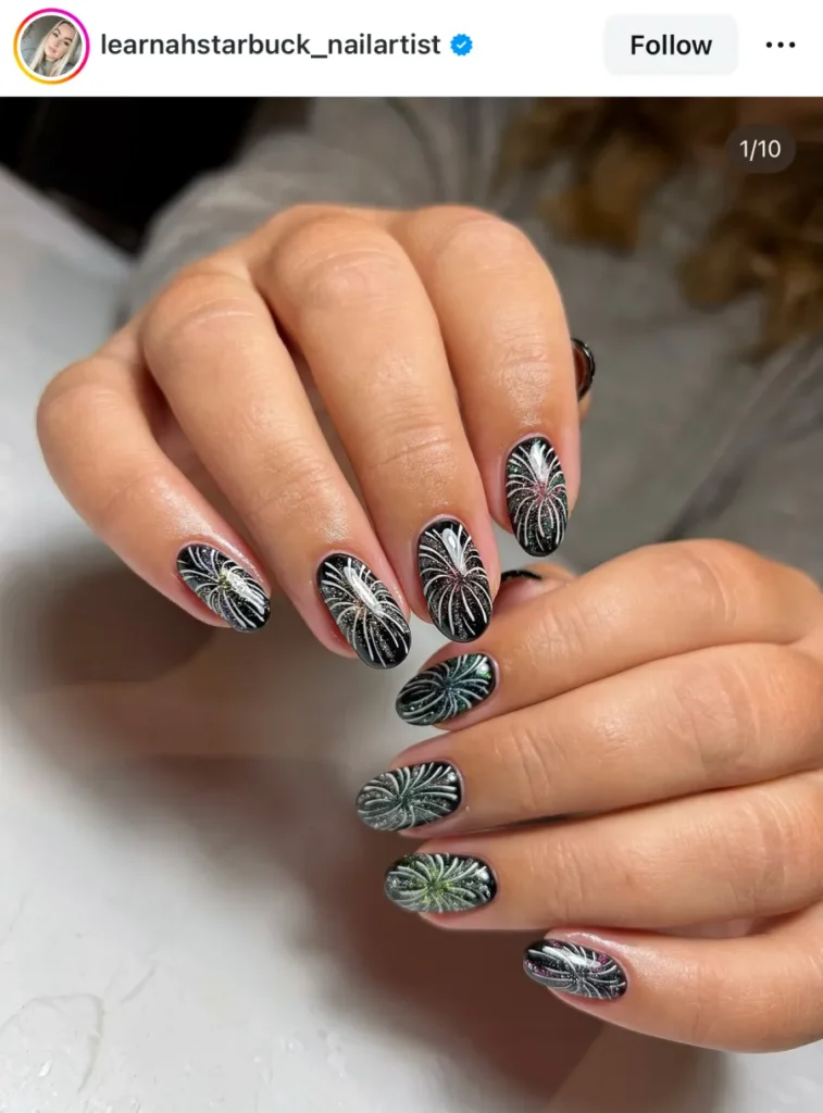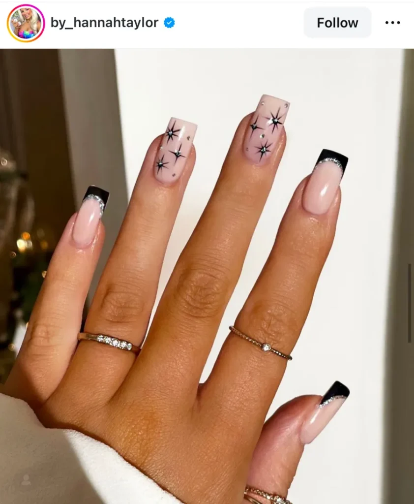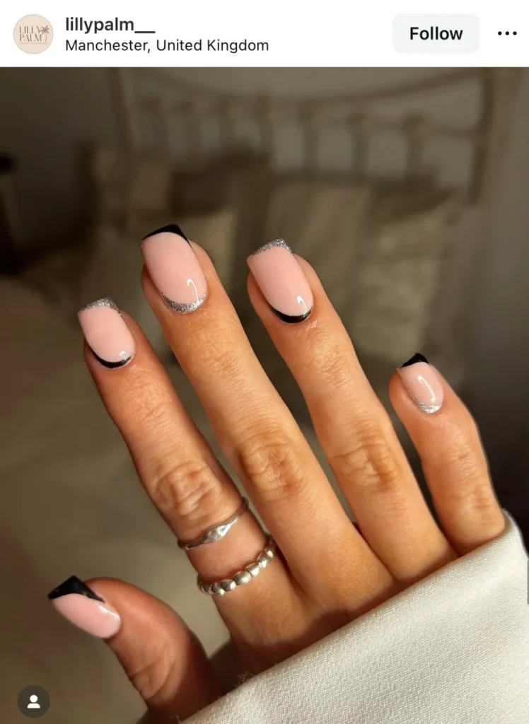 What makes this one so good is the balance. The black tips keep it grounded, and the silver glitter lines catch light just enough to make it look alive. It’s clean, dramatic, and honestly — perfect for New Year’s Eve.