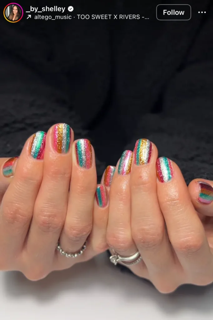 Short nails, clean lines, pure joy. The stripes look almost like streamers caught midair after the countdown. If you’ve ever wanted something that just makes you smile every time you look down, this is it.