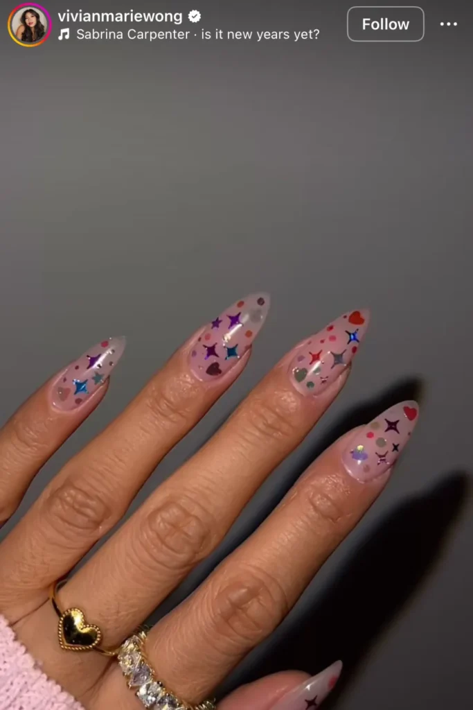 All those tiny bits of color scattered on nude nails feel spontaneous, like you just brushed your hand through a box of party confetti. Some days call for something polished, but this? This is the one for when you stop caring and start enjoying yourself.