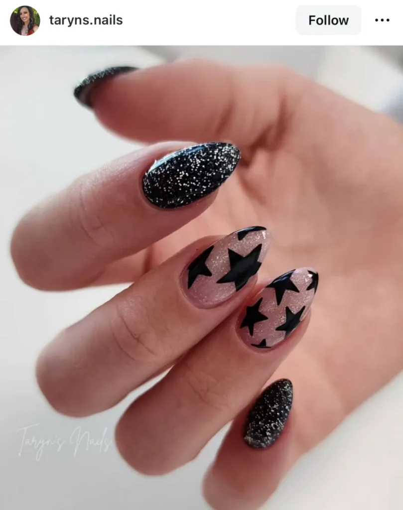 I don’t know why, but this design feels like a song. The tiny black stars scattered through the glitter look quiet at first, then suddenly sparkle like they’re pulsing to the beat.