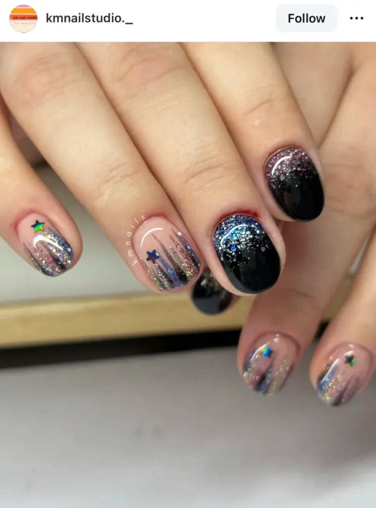 You know when a design looks messy in the best possible way? That’s this one. The short black nails fade into glitter strokes at the tips, and it feels a little chaotic, like a spark right before fireworks go off.