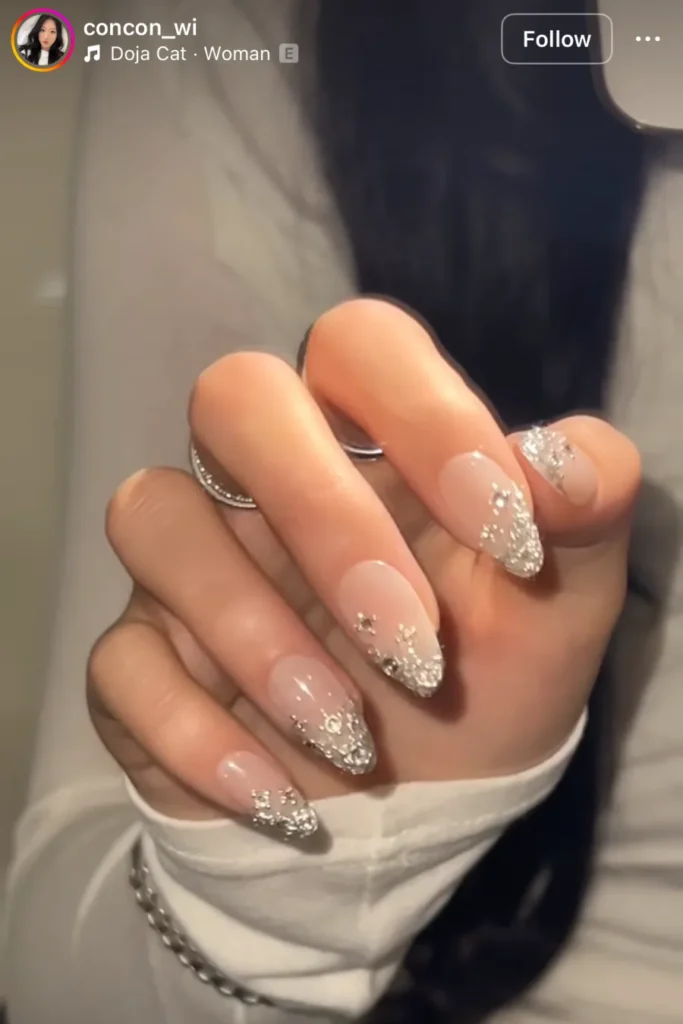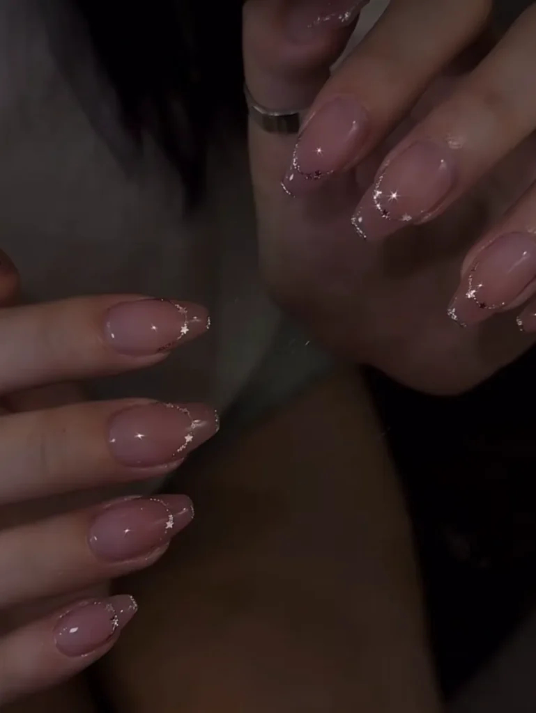 I love how the glitter piles up near the tips, almost like it drifted there overnight. It’s nude, but not quiet — more like bare skin under fireworks. Sometimes I think it’s too much, and then I see it under real light and, okay, no — it’s perfect.
