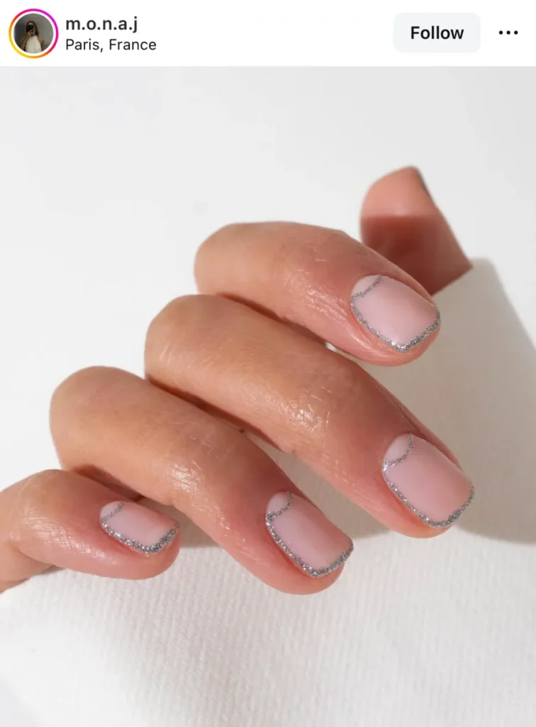 There’s something about a silver outline that always gets me. It frames the nude base like jewelry, not decoration — just detail. When the light slides over it, it almost looks like glass edges.
