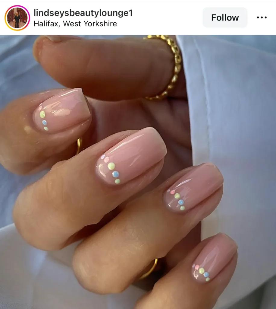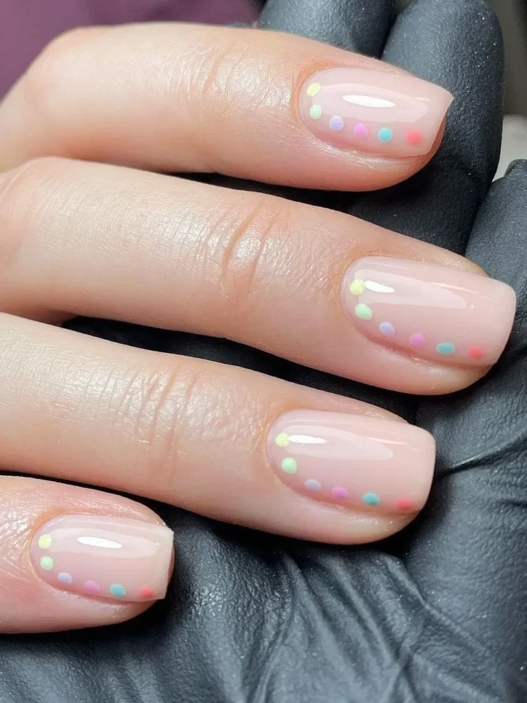 If you want color without the commitment, try a row of tiny pastel dots along the side of a nude nail. It’s like a minimalist rainbow.