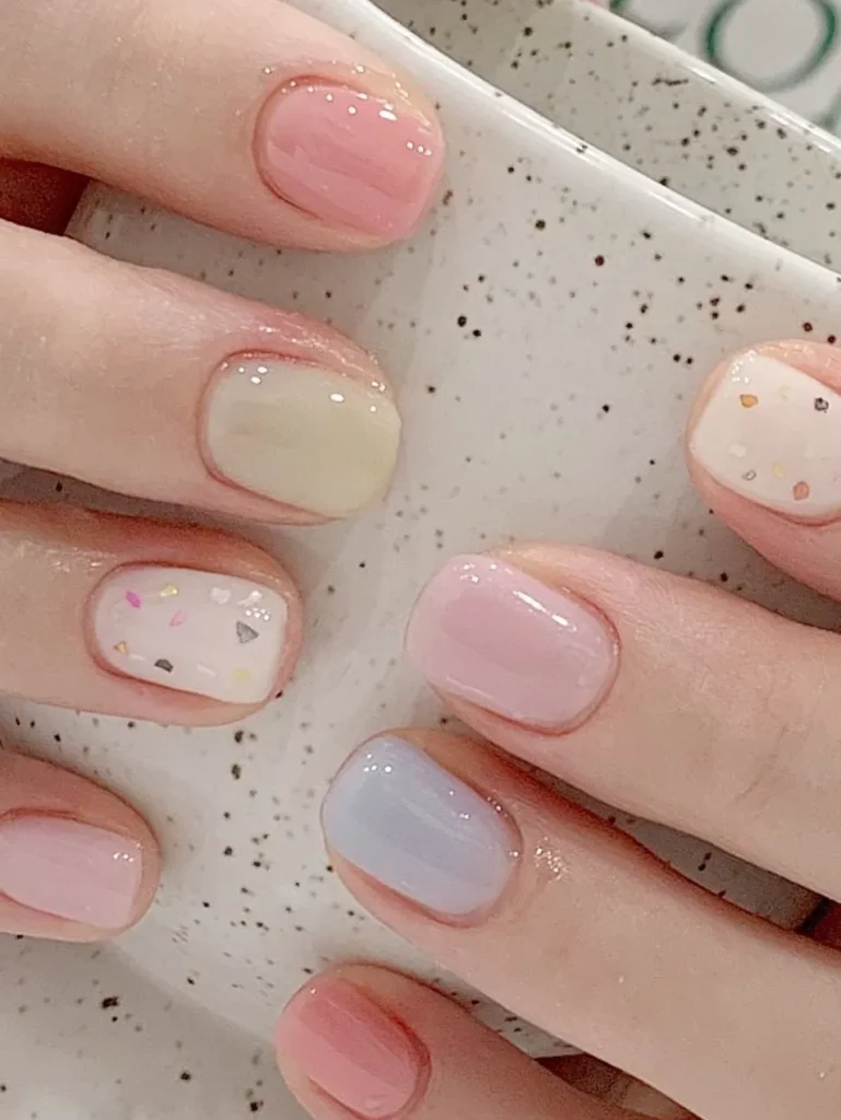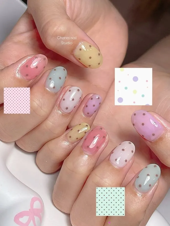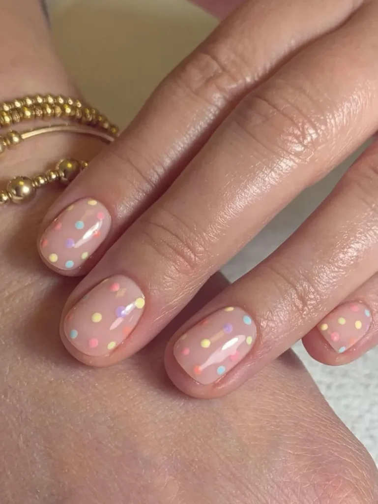 This is my favorite DIY-friendly look. Just a naked nail with random pastel dots—simple, playful, and totally chic.