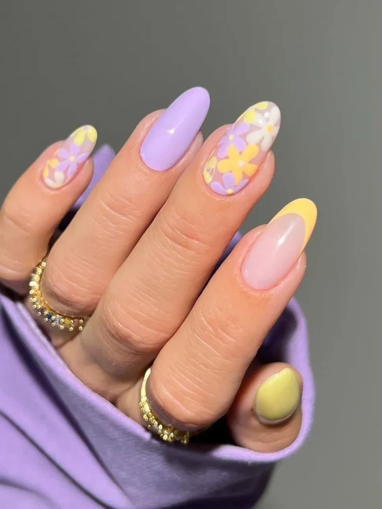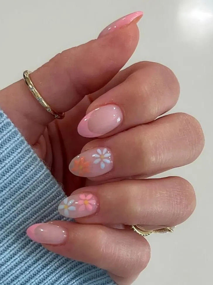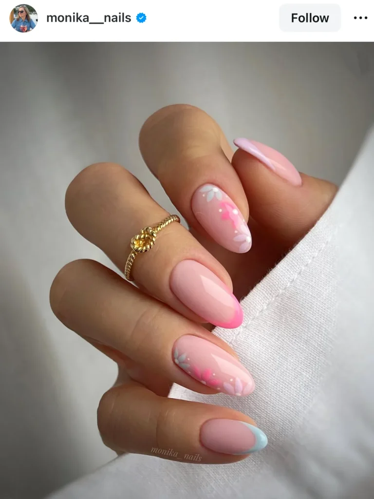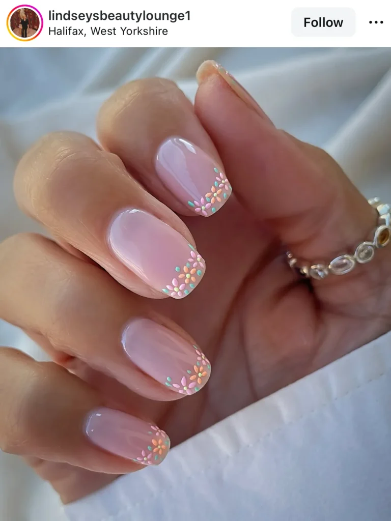 A classic pink French tip but covered in tiny, colorful wildflower patterns. It’s a spring staple for a reason.