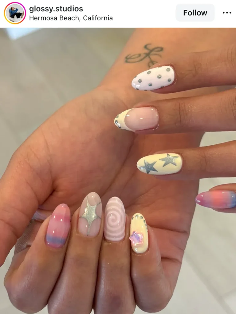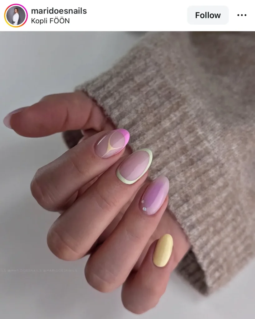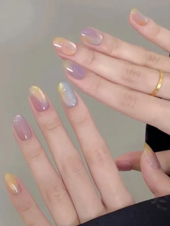 I usually keep four nails solid and then go wild on the ring finger with a watercolor mix of blue, yellow, and pink. It’s the perfect balance.