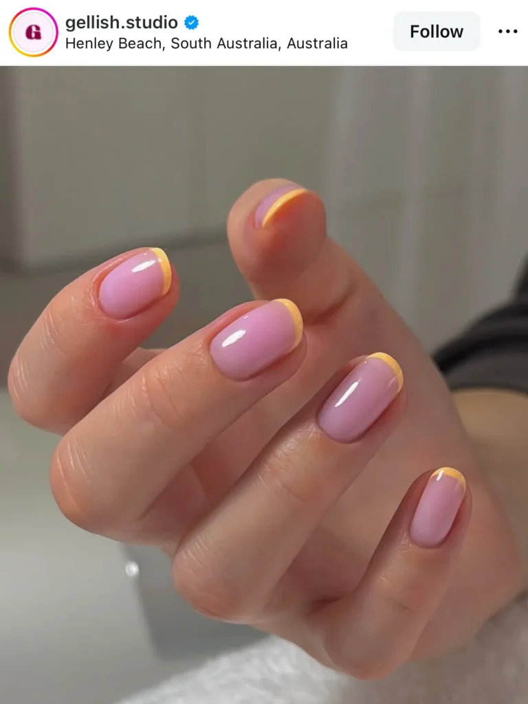 Short nails look so cute with this warm combo. The peach tips over a soft pink base remind me of a spring sunset.