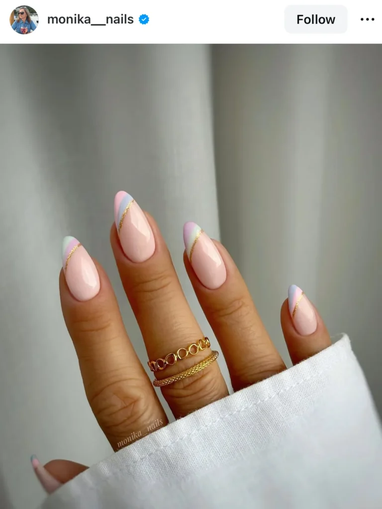 There’s something so chic about a gold glitter line. It separates two different pastel blocks and instantly makes the mani look like a luxury accessory.